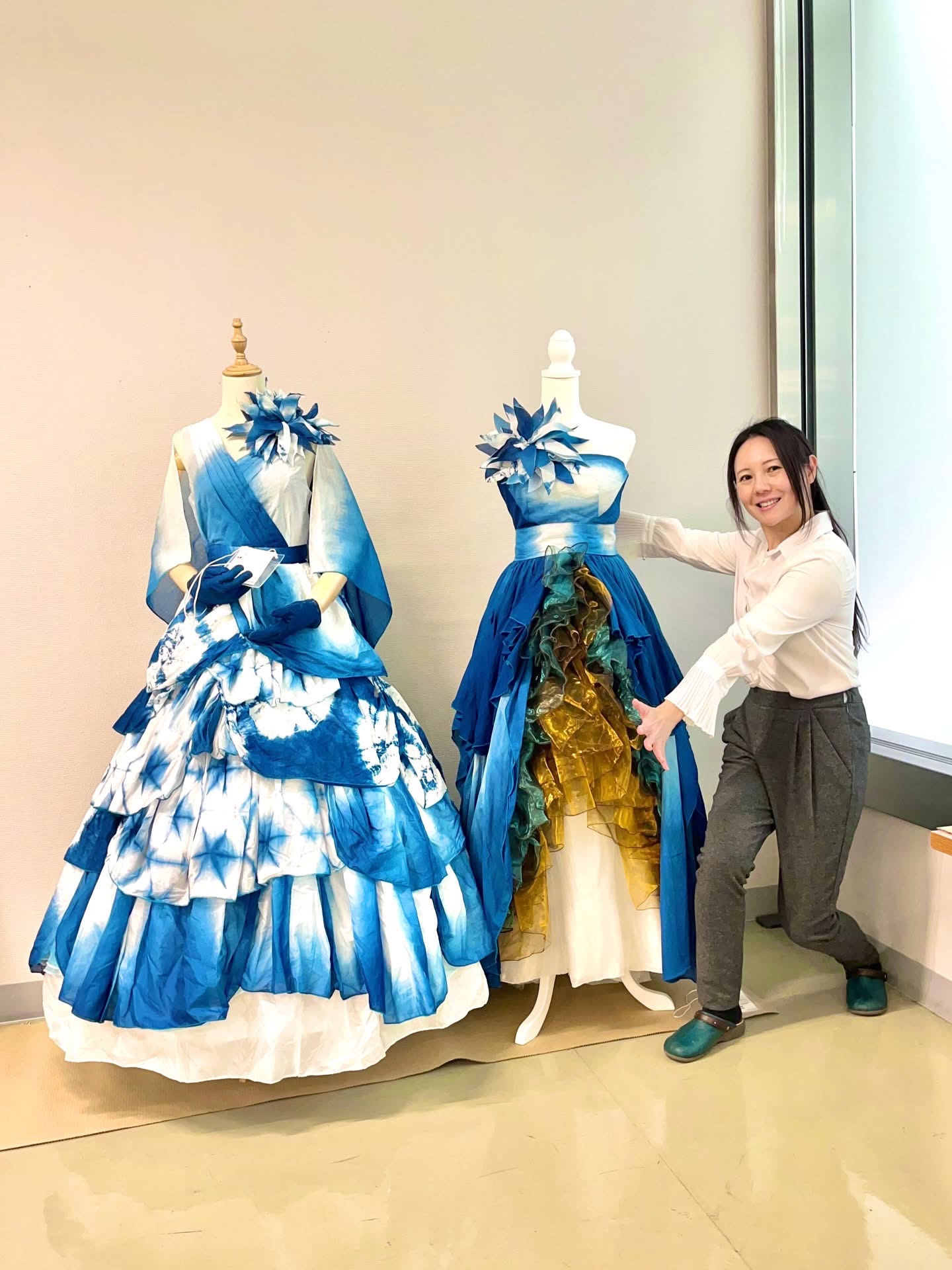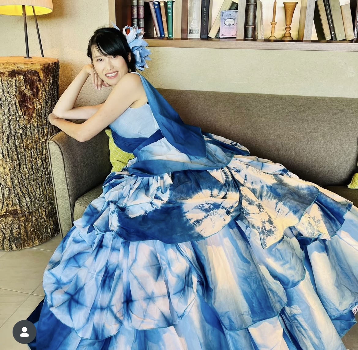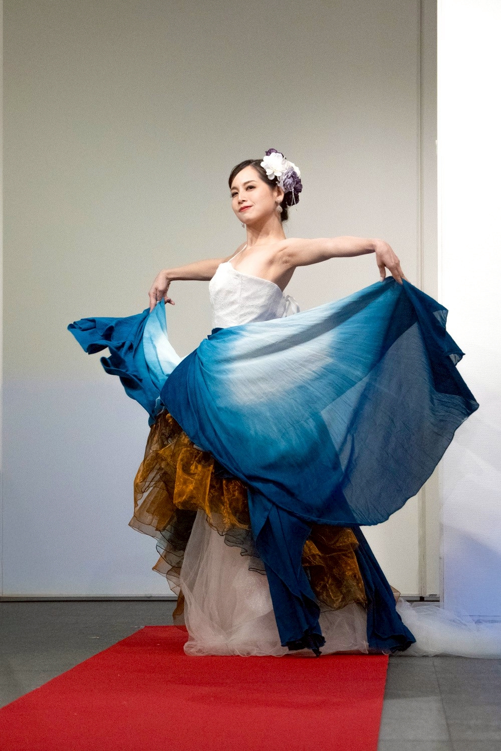 奈良県大和郡山市「ふれ藍工房 綿元」様にて直接布を染めるところから制作された唯一無二のドレス。