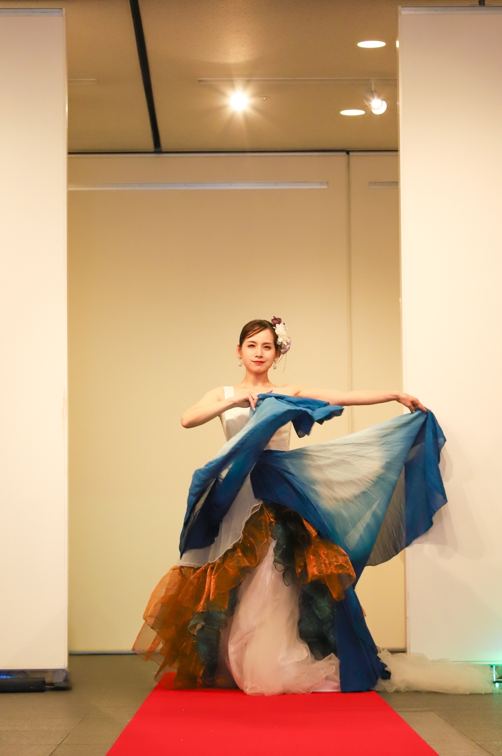 最後のドレスは、藍染工房「ふれ藍工房 綿元」様にて染められた藍染のドレスを着用。